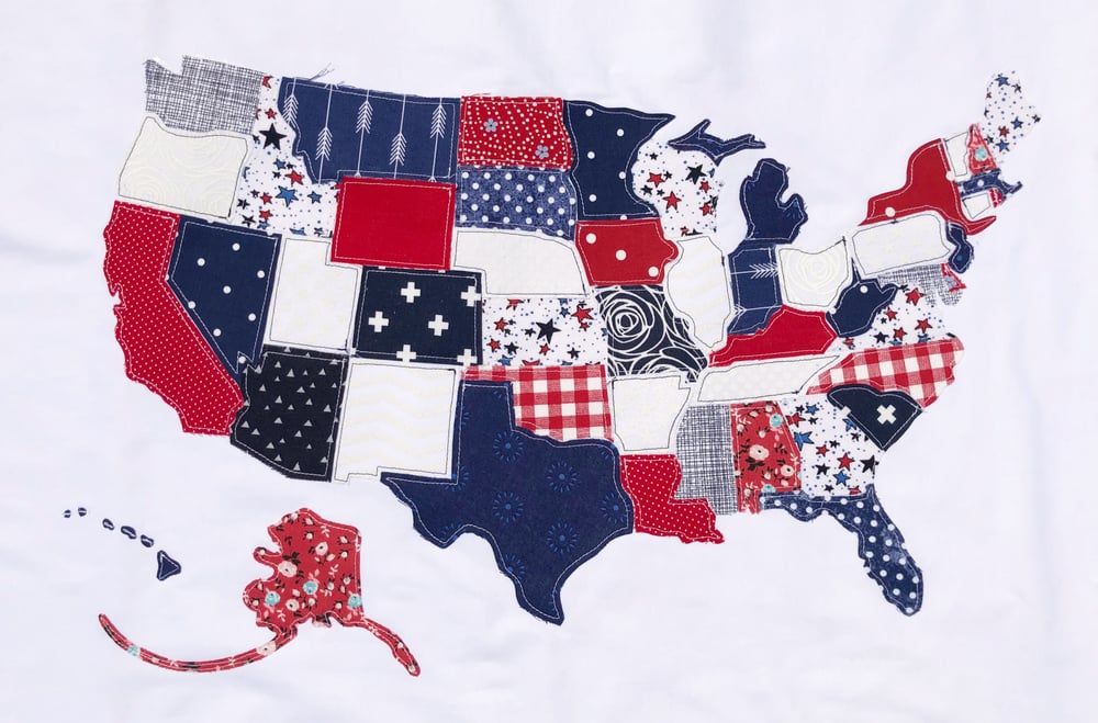 Sewing Sunflowers โ Bright Red||White||Blue USA Scrap Map